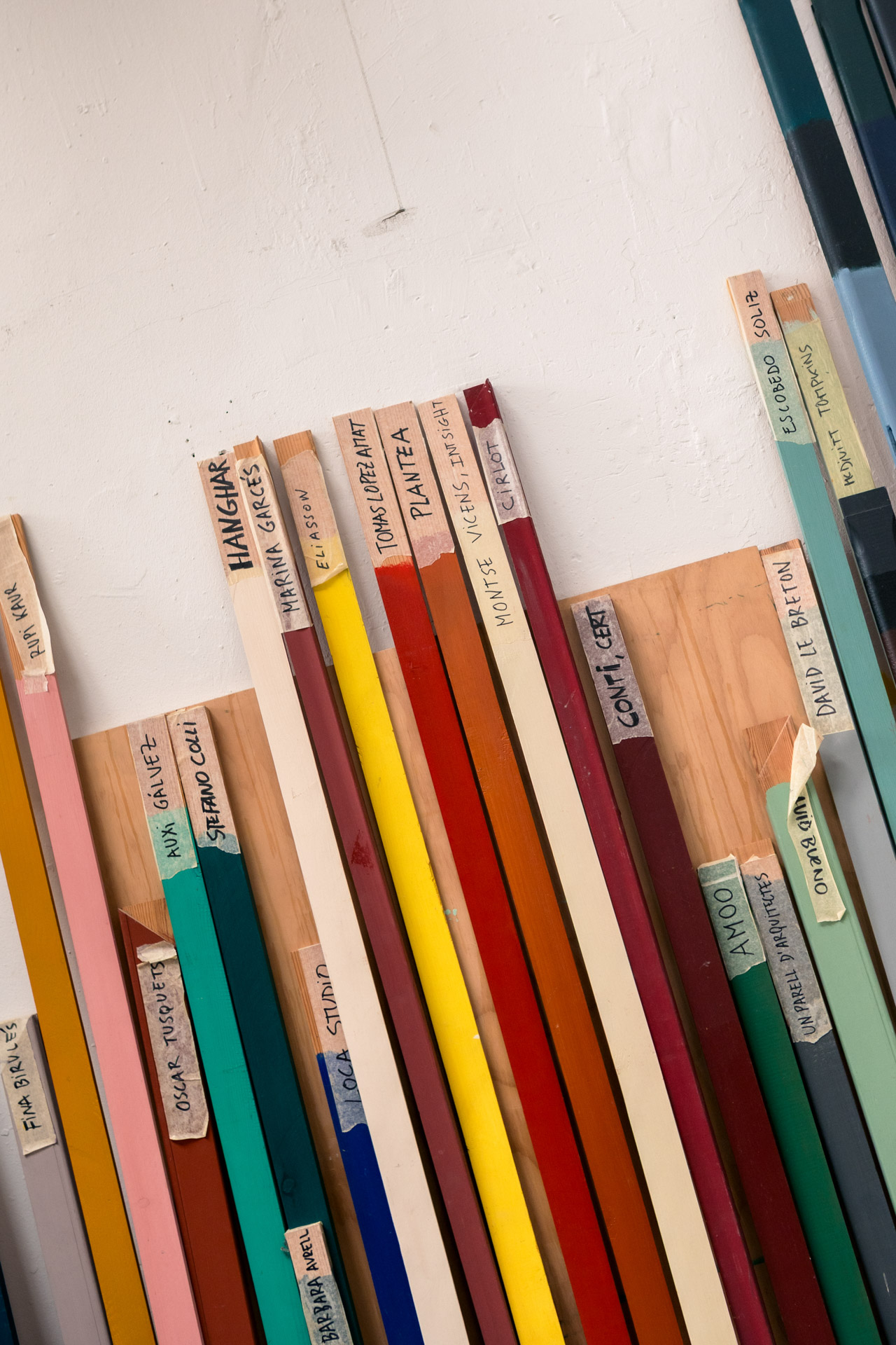 CV: I’ve spent the past ten years putting order to the colors that interest me. I have small drawers where I keep my color charts, all arranged by range. When I need them for a project, they’re right there, easy to access. I can only approach that bench with very clean hands! I also collect all the paint-lid palettes. All the colors I’ve ever mixed are recorded there.