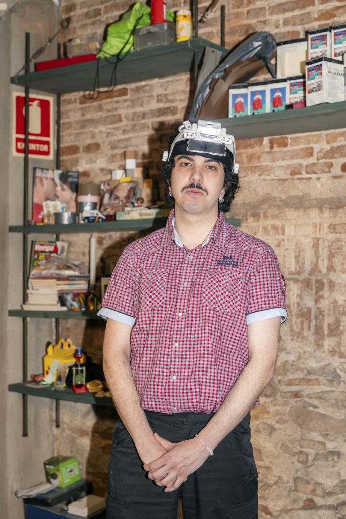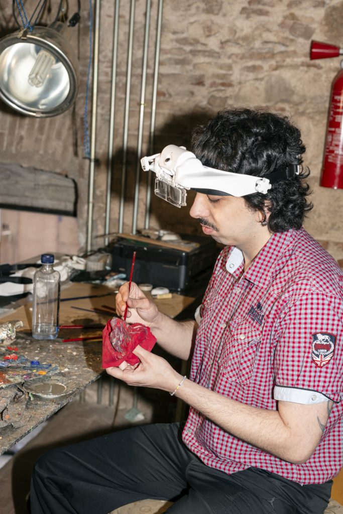In the heart of Barcelona’s Raval neighborhood, right in front of a fruit shop and on one of the busiest streets in the area, we find David Macho’s studio. He welcomes us on the ground floor of a space shared with other artists and leads us up a narrow wooden staircase to the loft where he works at least ten hours a day. Original, chaotic, and filled with curious and colorful objects, the studio perfectly matches David’s personality and his paintings.