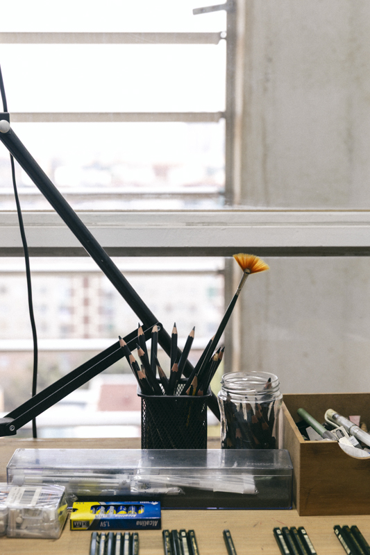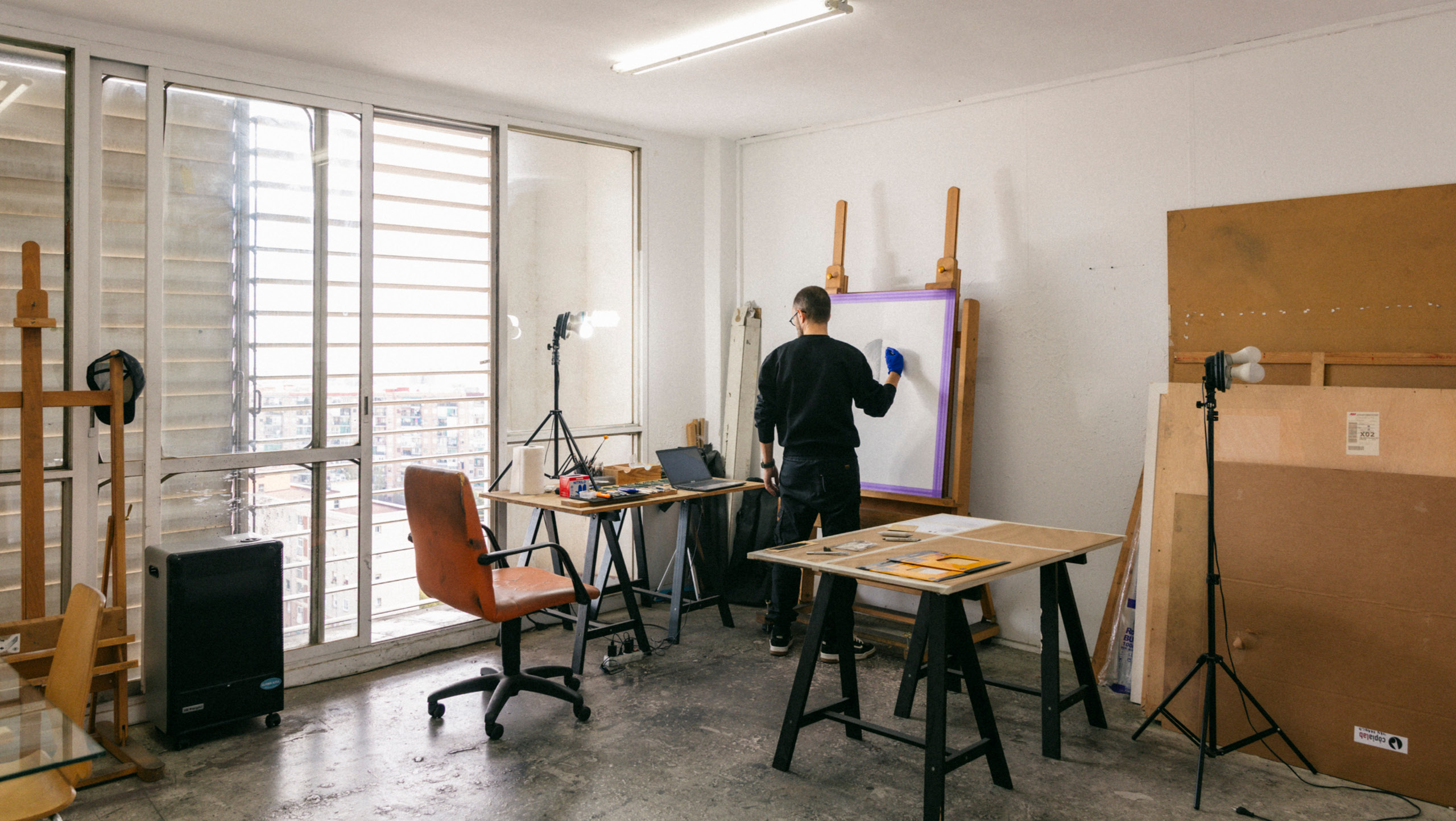 Iván Franco (IF): I usually come every day of the week, and I take weekends off. When I arrive early, the first thing I do is lift the blind and enjoy the views. The studio is on the 16th floor of a large building in La Pau, a nice neighbourhood in Barcelona. Starting the day with a wide perspective of the space gives me good energy. It is generally a very quiet place, so I get a moment to myself before beginning to work.